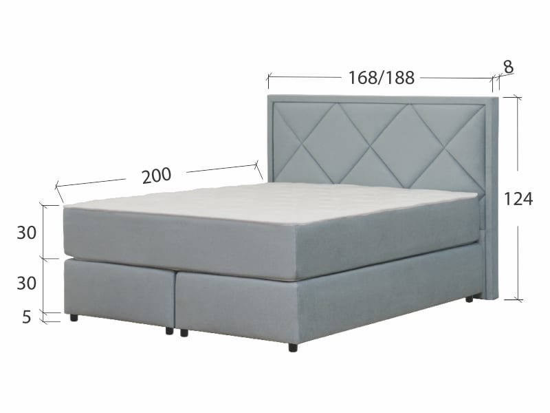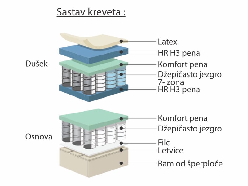 Boxspring krevet Venera – stilski i elegantan model sa zanimljivim i mekanim uzglavljem. Model ima visoki komfortni dušek, ali u celosti krevet izgleda skladno i elegantno. Komfortan dušek se sastoji od džepičastog jezgra 7-zona, sa udobnim slojem lateksa. Visina ležišta je 65 cm.