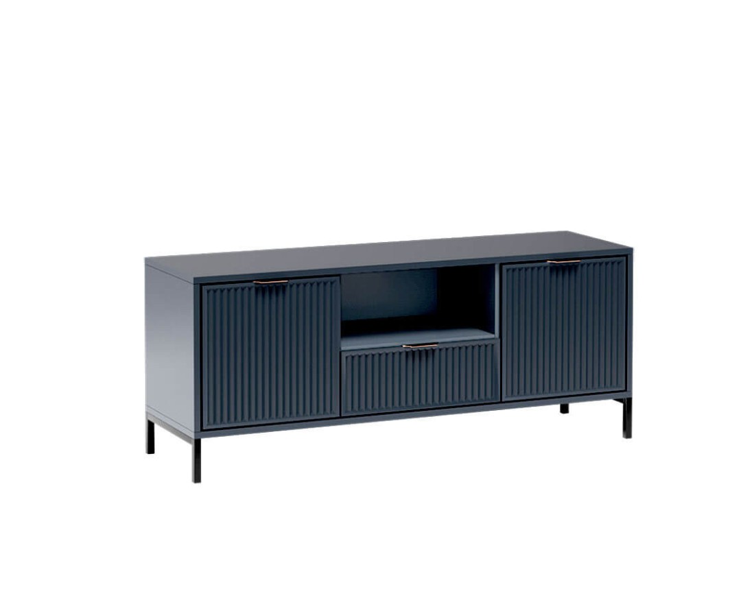 Moderan TV ormarić sa dizajnerskom završnom obradom. Srednji deo je praktična polica za set-top bok ili drugu RTV opremu, ispod prostrane fioke za razne sitnice. Sa strane, dva ormarića za dodatne stvari. Ormar u kombinaciji sa drugim nameštajem u dnevnoj sobi stvoriće prelep enterijer. Dostupan u dve boje – kašmir/indigo.